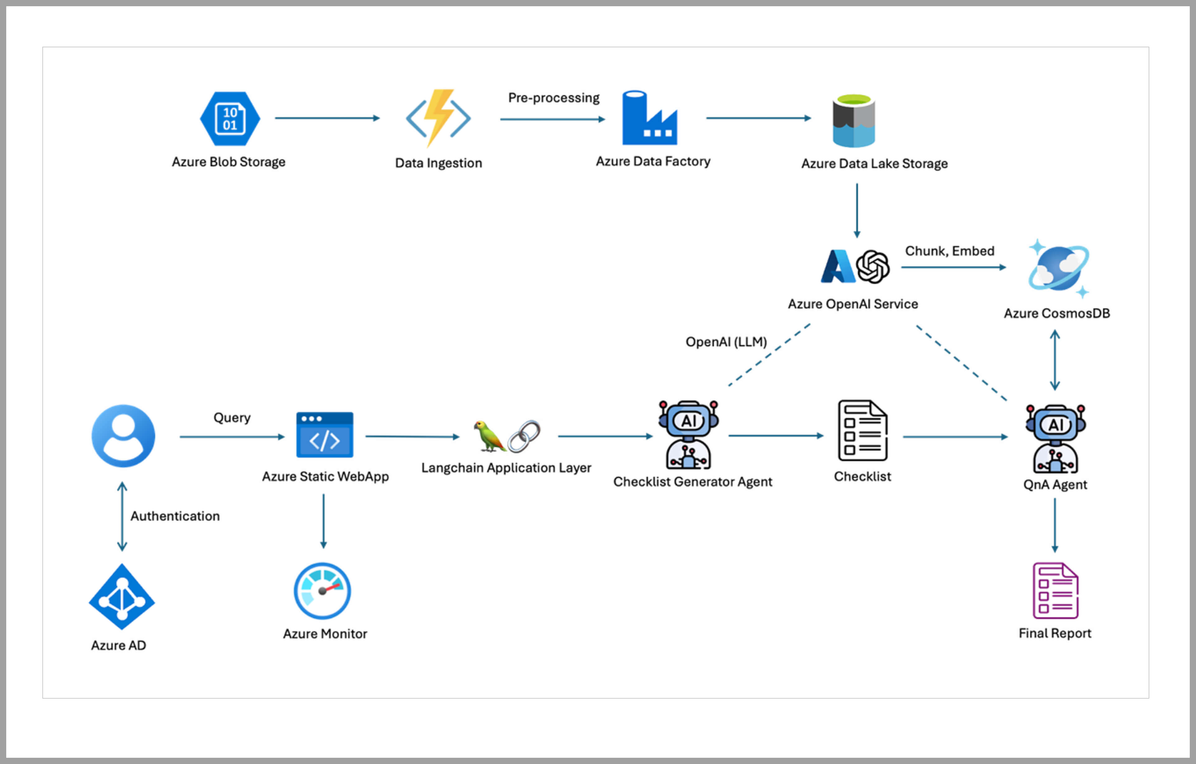 • Azure OpenAI Service + LangChain enables natural language understanding and checklist generation.