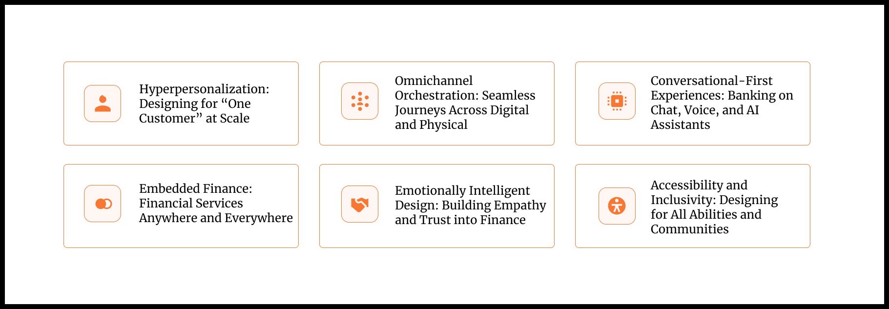 The financial services sector is on the cusp of a design renaissance. These six trends, hyperpersonalization, omnichannel orchestration, conversational interfaces, embedded finance, emotionally intelligent design, and accessibility, are interrelated and reinforcing. Together, they point toward a financial experience that is smarter, more seamless, more human, and available anywhere to anyone.