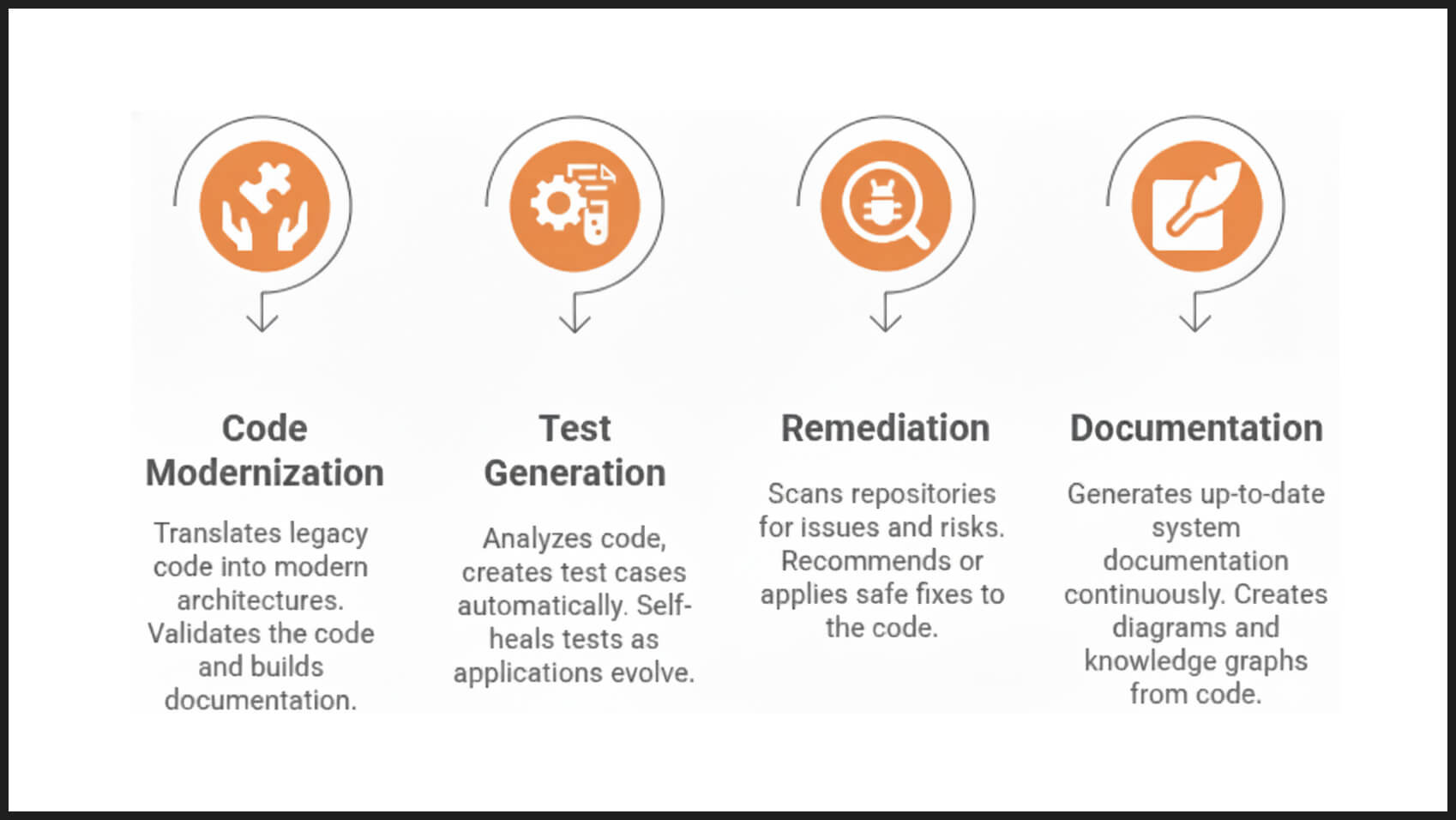 It works across the entire lifecycle from testing and remediation to modernization and documentation, bringing speed, accuracy, and consistency that human-only teams struggle to maintain. It’s powered by a mix of generative AI models, automated pipelines, and governance frameworks that ensure everything stays secure, compliant, and traceable.