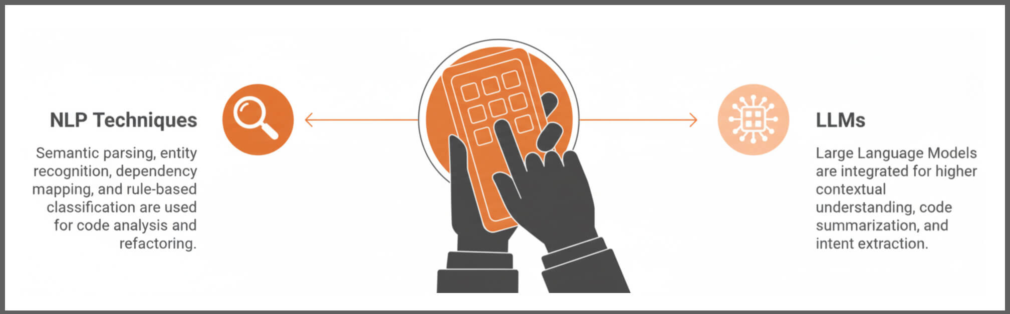 When precision, privacy, and predictability matter most, we rely on traditional NLP techniques, the tried-and-tested tools that safely analyze code structures, map dependencies, and extract business logic inside secure environments.